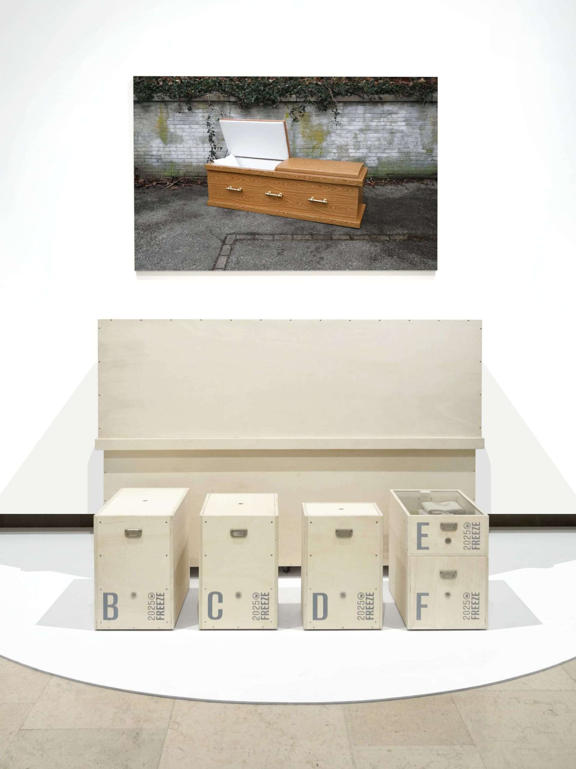 Par l’entremise de la photographie et de l’archive, Lor-K nous invite à faire un arrêt sur image (autre manière de traduire freeze) pour nous familiariser avec tous ces visages de la mort industrielle que nous créons et qui nous entourent. L’artiste a même orchestré son propre enterrement, et fabriqué son cercueil : dans un frigo glané dans les encombrants, elle a trouvé sa dernière demeure, gage de résurrection post-congélation ?