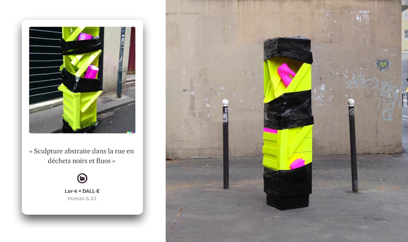 Pour son projet nommé « IA », Lor-K utilise Dall-E, un générateur d’images par intelligence artificielle. Avec une seule phrase clef : « Sculpture abstraite dans la rue, en déchets noirs et fluo » Lor-K obtient des propositions visuelles diverses. Le caractère illimité des rendus offre une vision inédite du potentiel esthétique des déchets.