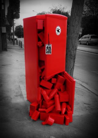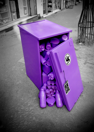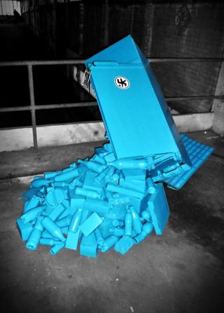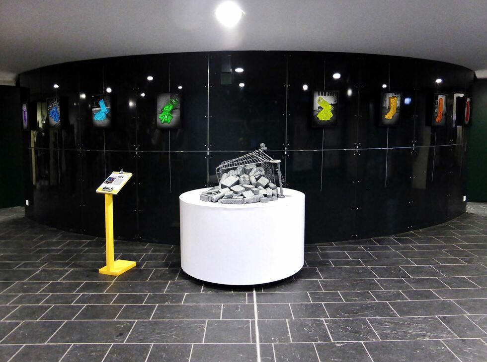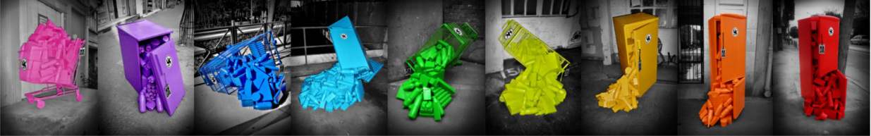 Une fois l'objet remplit d'emballages, le recouvrir uniformément de peinture. En fort contraste avec l'arrière-plan bétonné, choisir des couleurs vives qui attirent l'œil, comme une tache dans le paysage. Avec un fort pouvoir couvrant et un séchage rapide, la bombe aérosol offre un rendu propre et net, sans coulure, ni bavure. Utiliser une bâche pour protéger le sol des projections poussiéreuses de couleurs. En un mois, neuf interventions furent validées dans différentes villes de la région Parisienne. Abandonnées sur place après création, les sculptures sont destinées à disparaître dans le rythme des villes investies. Photographies et vidéos permettent de découvrir le projet après sa réalisation extérieure. L'exposition se dévoile alors comme un moyen de transmission du processus créatif global grâce à la retranscription. |