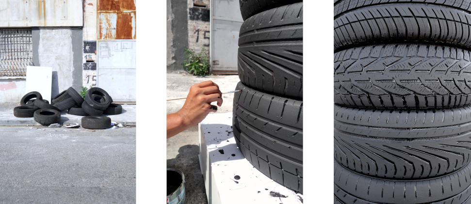 La roue, élément de base de nos moyens de transports, est omniprésente dans nos vies. Son évolution matérielle et ses déclinaisons à travers le temps, en font un objet technique indispensable. Sa représentation universelle est symbole de mobilité, d’évolution et d’indépendance. Pourtant, son utilisation quotidienne nous est bien souvent insouciante. De cette utilisation massive, le constat est clair, six pneus arrivent en fin de course chaque seconde. Composés de matières toxiques et peu dégradables, leur recyclage est complexe. Sur le territoire surgissent des cimetières sauvages à la douce odeur caoutchouteuse. Dans ces zones, à l’abri des regards et intimement vastes, s’empilent d’innombrables cadavres de pneus. Du paysage à l’abandon émerge une stèle éphémère noirâtre. Soigneusement choisis et empilés, une sélection de pneus est unifiée, maquillée, magnifiée. Jouant entre brillance et matité, une fois peints, ils retrouvent un éclat d’origine superficiel. Embaumés et disposés ainsi sur un piédestal, ils paraissent comme parachutés dans un contexte inapproprié.