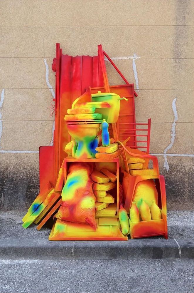 La chaleur représente l’un des enjeux majeurs de nos sociétés. Le réchauffement climatique est en lien direct avec nos manières de vivre et de consommer. Nos méthodes de productions excessives impactent notre environnement et complexifient les notions de revalorisation. Tous les objets représentent un coût énergétique dont nous payons inconsciemment le prix. Les couleurs visibles sur les déchets sont dictées par une caméra thermique et représentent la chaleur emmagasinée par chaque objet. L’outil numérique permet d’accéder à une perception invisible à l’œil nu. À partir du smartphone, la photographie capturée devient modèle impressionniste. Par reproduction, la peinture se dessine en volume. Les couleurs peintes à la main font émerger du sol un dégradé multicolore et chatoyant. En fort contraste avec son contexte, le résultat attire notre regard par son esthétique criarde et surréaliste. Généralement inaccessible, une réalité scientifique devient soudainement perceptible, insufflant une nouvelle profondeur aux objets qui nous entourent.