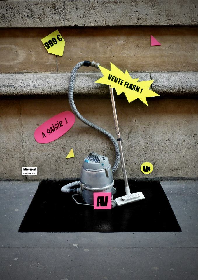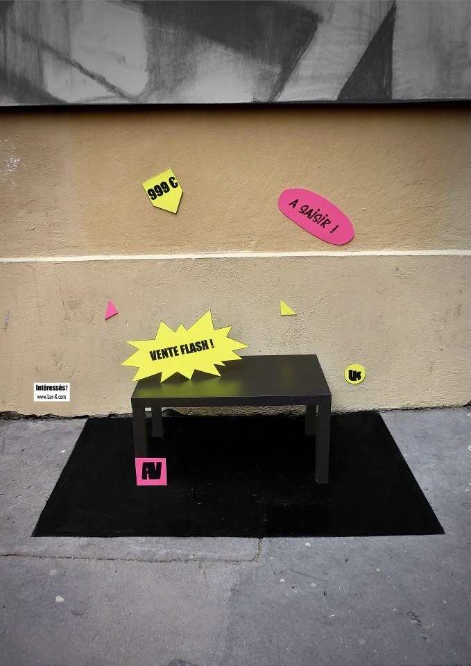 Orchestrées dans les rues de Paris un 1er avril, des pancartes aux couleurs criardes, annoncent une mise en vente imminente. À saisir, en pleine rue, sur un marquage au sol noir, mobilier et électroménager sont placés au centre de l’attention. Affichant un prix excessif, en contradiction avec leur posture d’abandon, un mercantilisme ambigu s’installe. Entre objets convoités et encombrants délaissés, notre interprétation est troublée par le soin accordé à la mise en scène. Poussée à son paroxysme, la présentation commerciale nous invite à questionner l’aspect manipulateur du merchandising et de la publicité. Du primaire au plus superficiel, le marketing anticipe tous nos besoins. Sur le trottoir, laissé à son libre-arbitre, notre jugement de valeur est mis à l’épreuve par la situation.