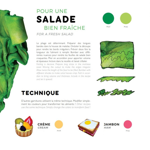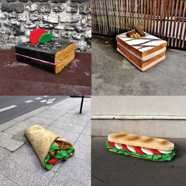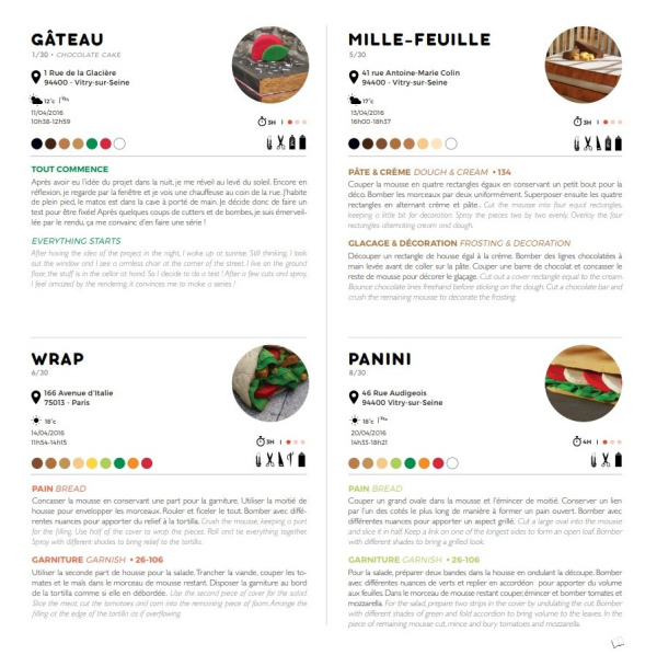 Trouvés dans la rue, les matelas sont transformés directement sur le trottoir en appétissantes sculptures. Scies, cutters, scotchs et bombes de peinture deviennent les ustensiles d’une cuisine insolite. Après préparation, pâte, crème, garniture et coulis, surgissent de la mousse ! Symbole d’une restauration rapide présente en masse dans nos villes, les plats choisis sont universels et facilement identifiables. A l’image de notre industrie alimentaire globalisée, pizza, panini, kebab, et autres recettes sont concoctées avec minutie pour offrir un rendu bluffant de réalisme. Surdimensionnés et colorés, ces mets d’un nouveau goût attirent alors tous les regards. Abandonnés dans le paysage urbain, les matelas auparavant repoussant deviennent soudainement alléchants. Page à page, le livre dévoile tout les secrets de fabrication de projet Street art insolite !