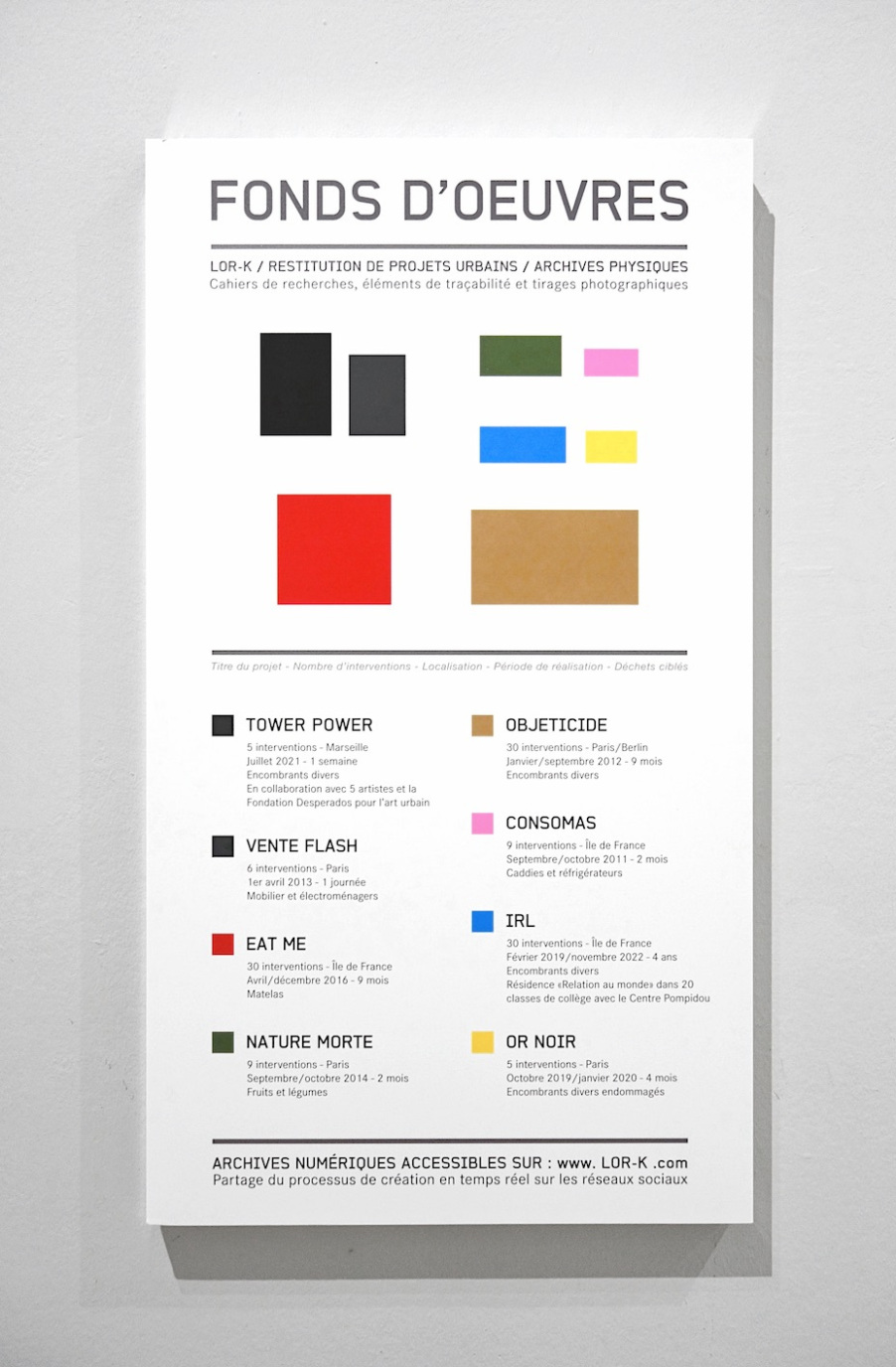 Directement dans la rue, Lor-K érige des sculptures à partir de nos encombrants urbains. De ces actions, aux matières premières des plus modestes, émergent des métamorphoses surprenantes et atypiques ! Fascinée dès son plus jeune âge par la capacité de la photographie à immortaliser l’instant, elle développe une obsession pour la prise d’images de ses sculptures au devenir mystérieux. La conservation, la classification et la diffusion de ces visuels troublent alors les frontières entre archives documentaires, reproductions et œuvres d’art.