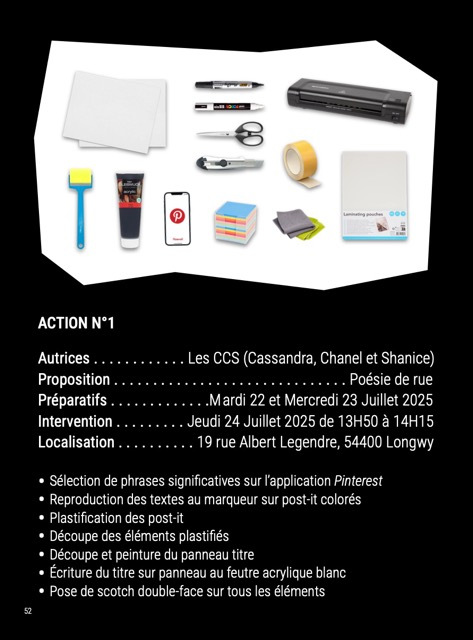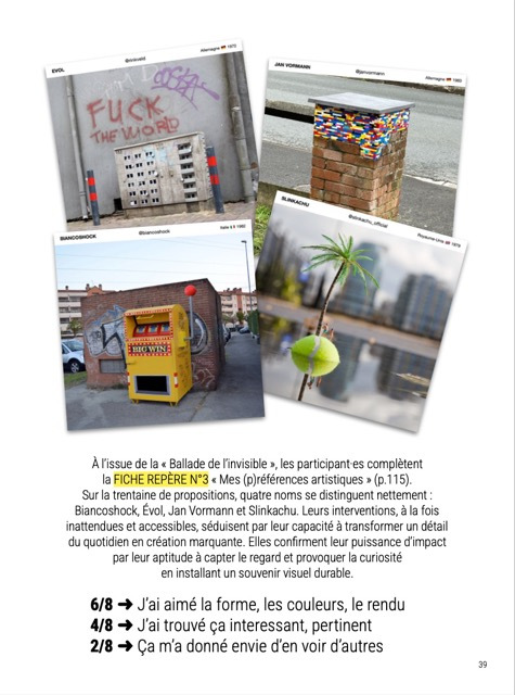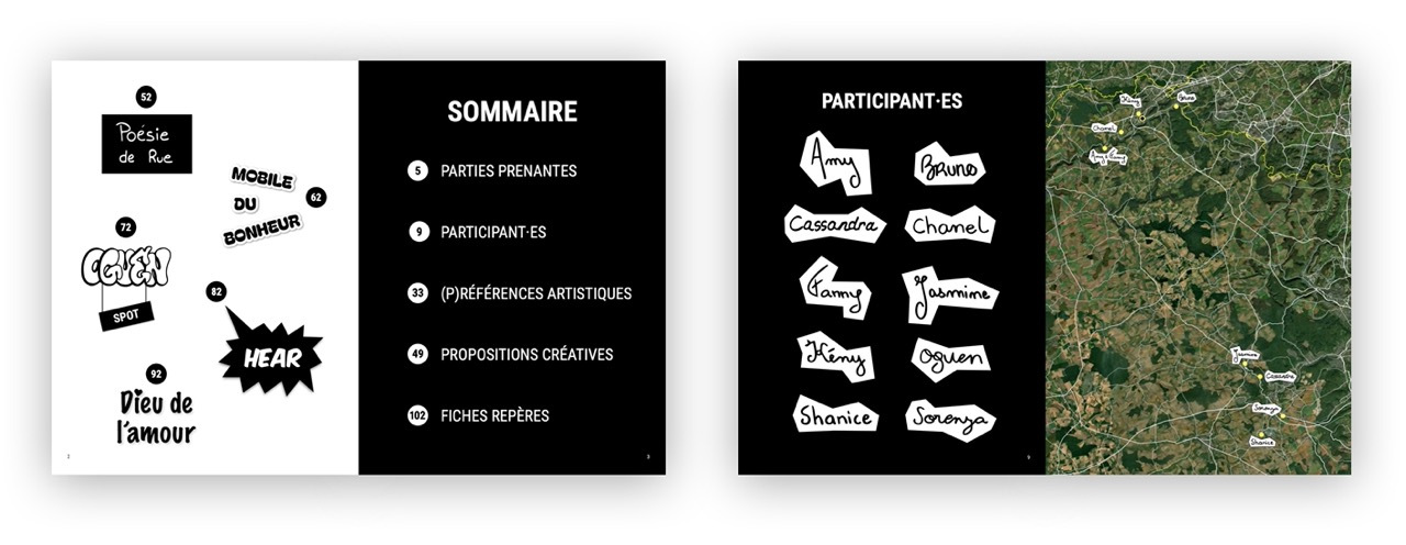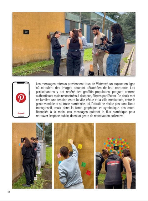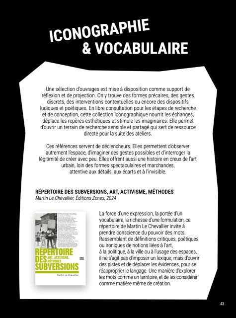 Sous forme de cahier de recherche, l'édition suit pas à pas ces participant·es qui explorent pour la première fois l’idée d’agir dans leur environnement quotidien, en posant un geste artistique dans l’espace public. Il donne à voir comment l’art peut devenir un levier d’expression, d’appropriation et de projection.