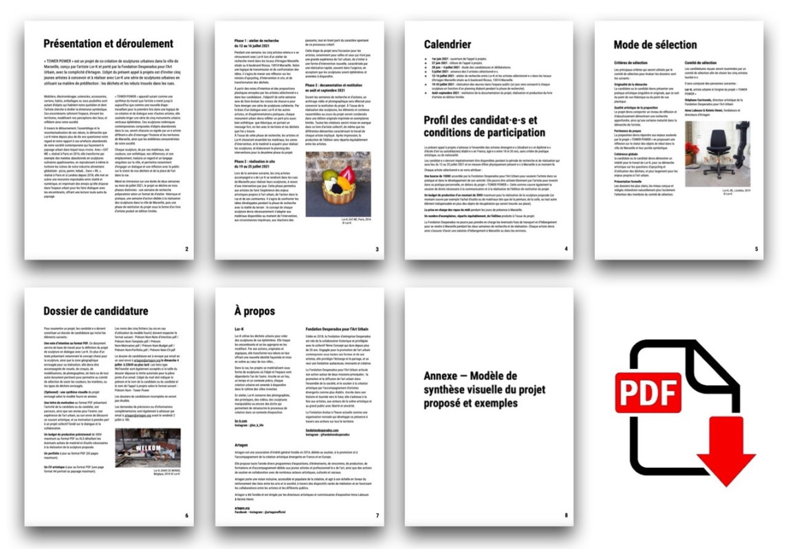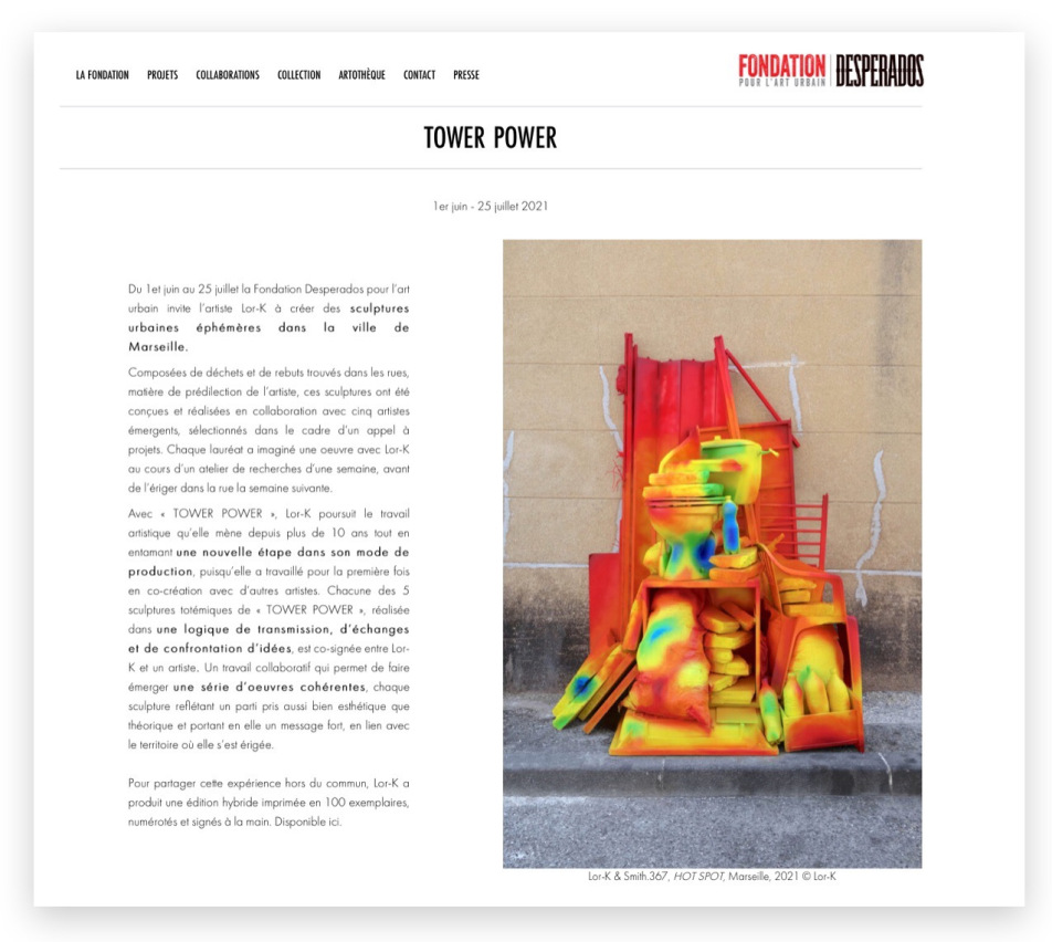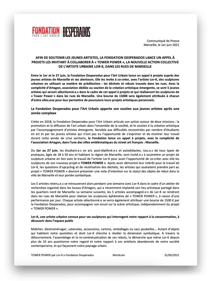Entre le 1er et le 27 juin, la Fondation Desperados pour l’Art Urbain lance un appel à projets auprès des jeunes artistes de Marseille et ses alentours. Elle les invite à co-créer, avec l’artiste Lor-K, des sculptures urbaines en utilisant sa matière de prédilection : les déchets et rebuts trouvés dans les rues. Avec la complicité d’Artagon, association dédiée au soutien de la création artistique émergente, ce sont 5 jeunes artistes qui seront sélectionné.e.s dans le cadre de cet appel à projets et qui réaliseront les sculptures de TOWER POWER dans les rues de Marseille. Une bourse de 1500€ sera également attribuée à chacun d’entre eux pour leur permettre de poursuivre leurs projets artistiques personnels.