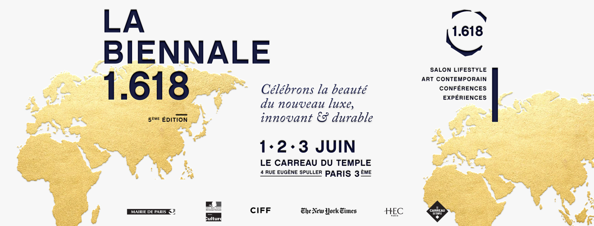 Cinquième édition incontournable de l'évènement de l’agence 1.618 Paris, spécialiste du Lifestyle durable et du Nouveau luxe, prendra ses quartiers du 1er au 3 Juin 2018 au Carreau du Temple, à Paris. Cet événement bouillonnant, participatif et innovant se tiendra en ouverture de la Semaine Européenne du Développement Durable. Avec un Salon de l'Art de vivre durable, une exposition d'Art Contemporain "Pure Waste", un espace de programmation d’expériences et d’émotions, et un cycle de tables rondes passionnantes... La Biennale 1.618 promet d'être un événement riche en découvertes d’initiatives pointues. Véritable plateforme d’influences et d’inspirations, l’événement mettra en lumière les belles histoires et initiatives de marques créatives et engagées, d’entrepreneurs, d’ONG, d’artistes et visionnaires mobilisés pour penser le luxe de demain et créer un futur plus responsable, en harmonie avec la nature.