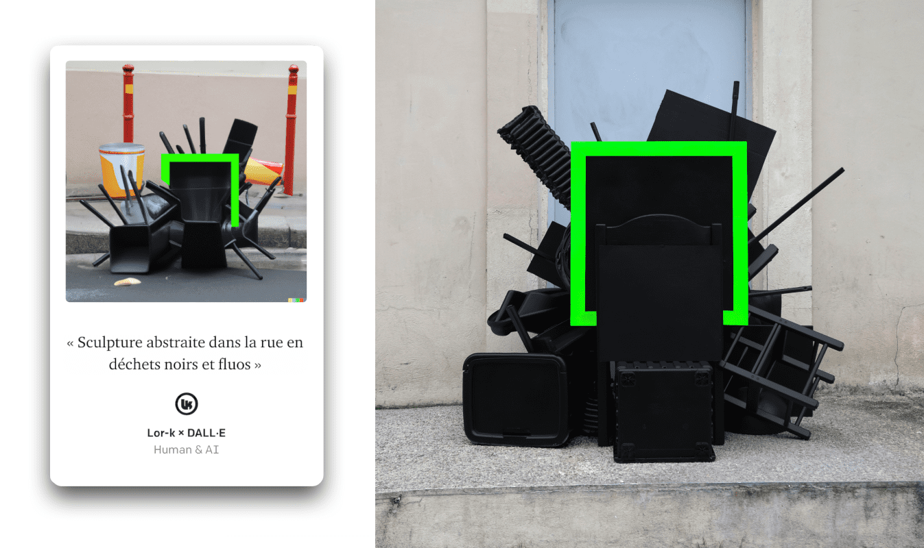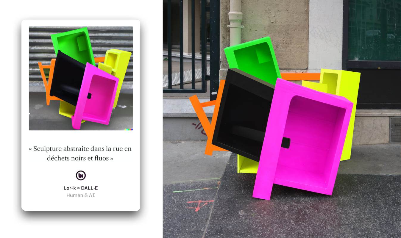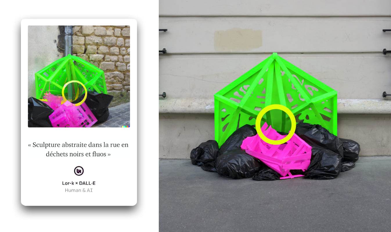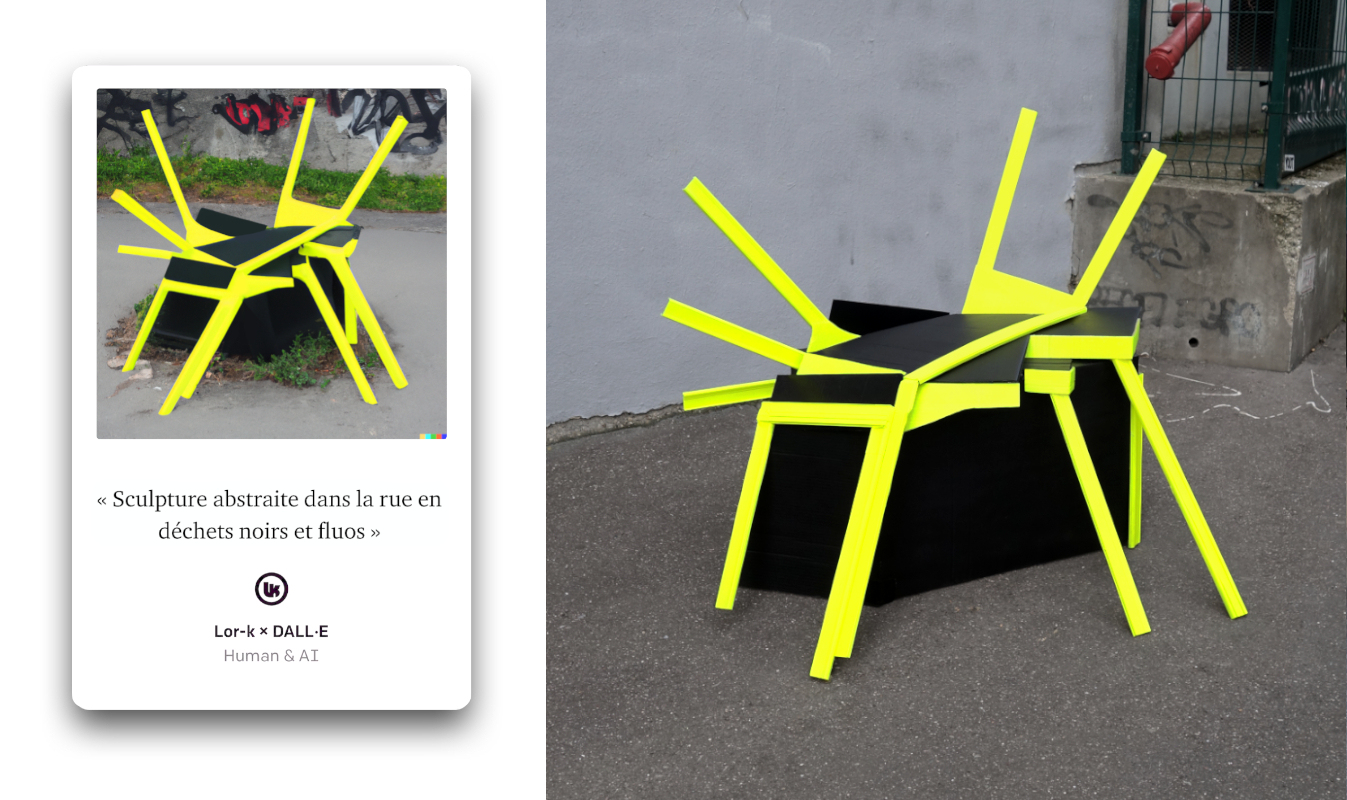 Pour son projet nommé « IA », Lor-K utilise Dall-E, un générateur d’images par intelligence artificielle. Avec une seule phrase clef : « Sculpture abstraite dans la rue, en déchets noirs et fluo » Lor-K obtient des propositions visuelles diverses. Le caractère illimité des rendus offre une vision inédite du potentiel esthétique des déchets.