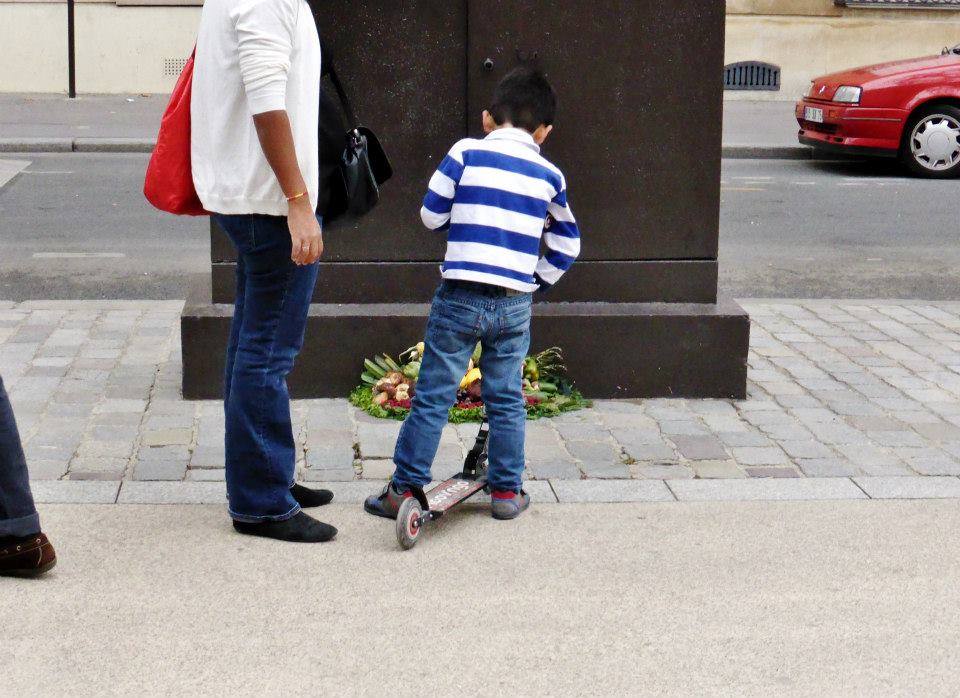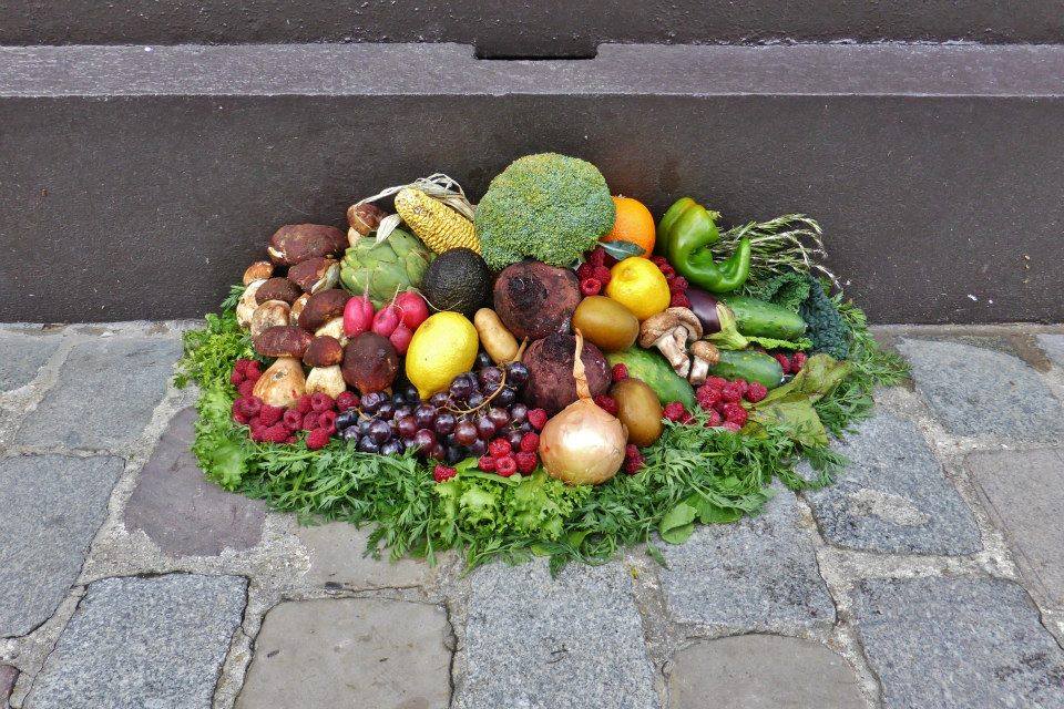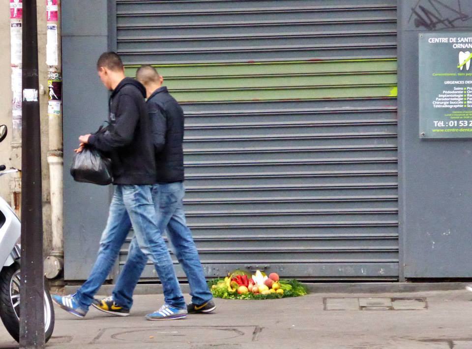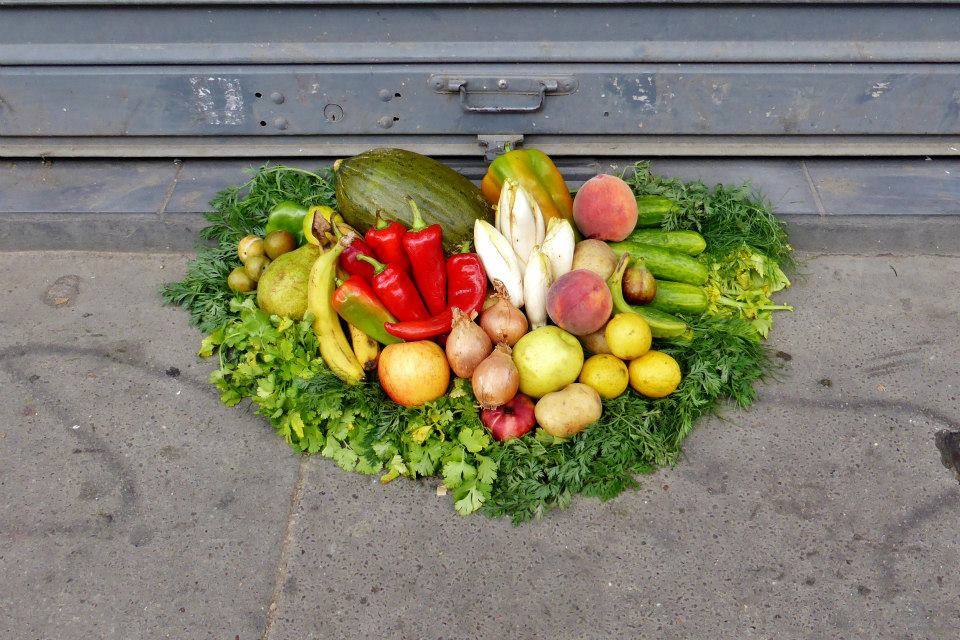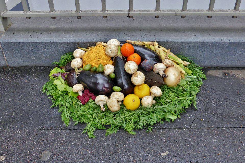 Abandonnés dans le caniveau de nos marchés parisiens, des fruits et légumes clinquants se voient attribuer un sort tragique et injustifié : la mort avant consommation ! Jeter anodinement sur la voie publique, à la merci des nettoyeurs accompagnés de bennes et karchers, leur exécution quasi-immédiate ne laisse que peu de place au sauvetage. Seule une poignée d’aguerris arrive à temps, au moment du grand nettoyage, pour une récolte urbaine express. Après la disparition totale du marché et de ses étalages, les denrées ramassées sont mises en scène, au même endroit, là où elles furent trouvées quelques heures plus tôt. Le contexte comme influence de notre perception du monde : nettoyés et assemblés sur un lit de verdure, ces déchets alimentaires se transforment alors en paniers garnis attractifs.