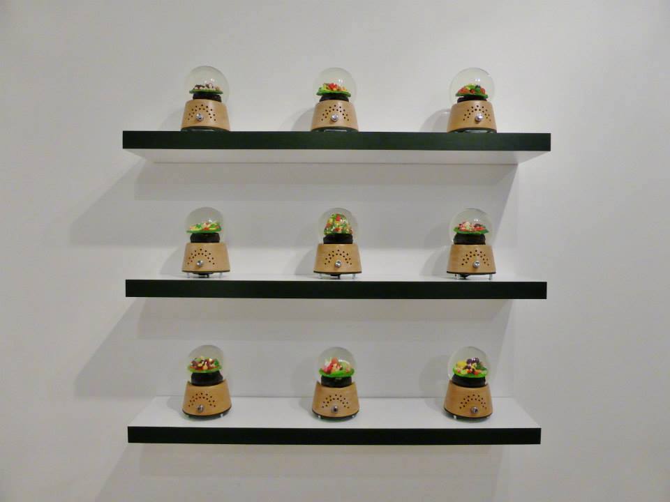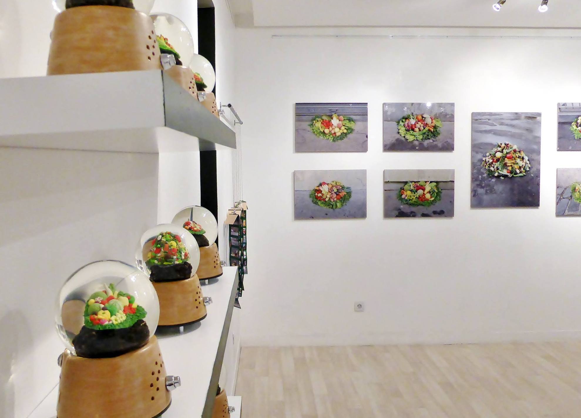 Réalisé en extérieur entre Septembre et Octobre 2014, le projet NATURE MORTE s'est implanté sur neuf marchés alimentaires Parisien. Couvrant ainsi les neuf points cardinaux, chacune de ces interventions a permis un quadrillage optimum de la ville. Avec des récoltes alimentaires comme but premier, chaque lieu a proposé son lot de détritus consommables. Du choux-fleurs, au radis, en passant par l'aubergine ou le champignon aucun de ces aliments n'a échappé au caniveau. Par terre, sur nos trottoirs, ces déchets sont alors utilisés pour créer des paniers garnis disposés à l'endroit même du marché après sa disparition. De ces situations, naît alors un dialogue entre les passants, le lieu et les denrées. Surpris, étonnés, choqués ou amusés, il s'agit alors de réussir à créer des œuvres qui permettront la découverte du projet en lieu d'exposition. Présenté à la Bab's Galerie en Novembre 2014, NATURE MORTE perdure et se transmet grâce aux œuvres qu'il en reste. | • 9 Nature morte (photographies d'installations urbaines) 40X60cm, plexiglas sur bois, impression unique • 9 Sonoglobes (sculptures manipulables et sonores) 12X12x20 cm, matériaux mixtes, confection unique • 9 Templans (sculptures manipulables) 15X20X5 cm, matériaux mixtes, confection unique • 9 déplitemps (sculptures manipulables) 8X6 cm, impressions montées en dépliants, confection unique • 1 archive vidéo (téléviseur mural) 30 minutes, clé USB, diffusée en boucle |