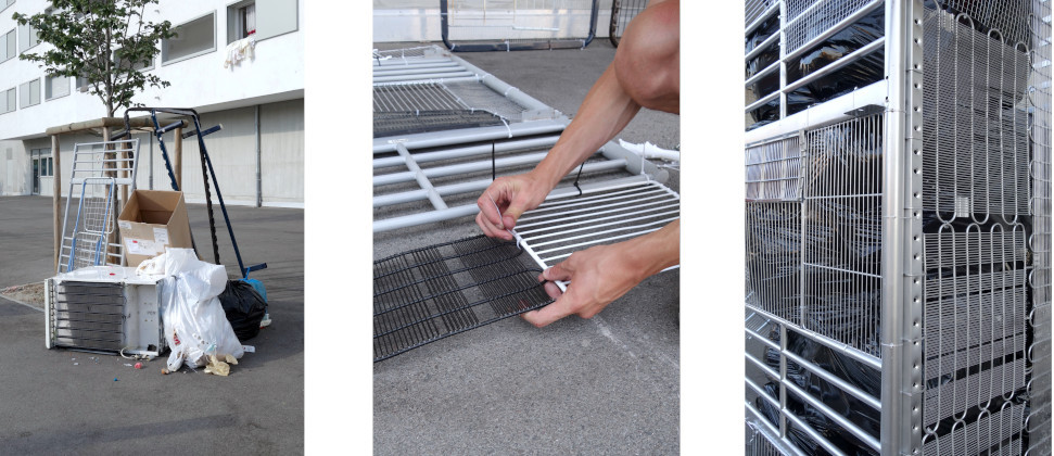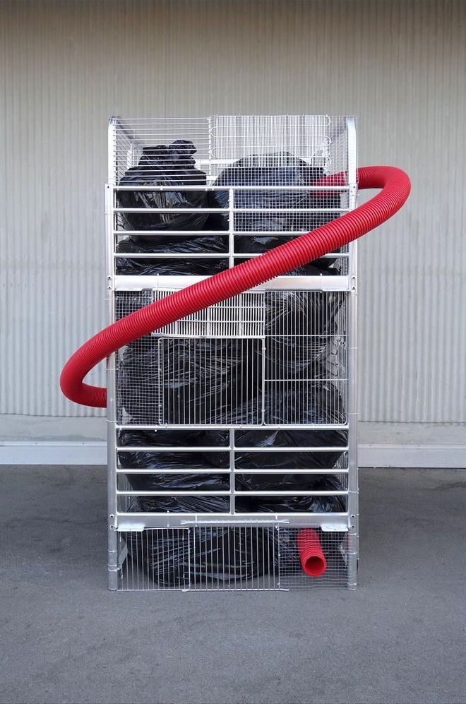 Terrain de jeu favori des rats urbains, les poubelles qui jonchent nos trottoirs font toute leur alimentation. En liberté rejetée, en cage chouchoutée, l’espèce à l’état sauvage ne jouit pas des mêmes privilèges que son homologue domestiqué. Pour mettre en lumière nos rapports contradictoires au monde, la traditionnelle cage à rongeurs est parodiée. Les structures de jeux, imposées aux rongeurs dans leur cage, sont des lieux de vies lugubres et restreints où l’exercice de notre pouvoir se joue. En véritable oppresseur, nous nous faisons maîtres et témoins de tous leurs moments de vie, même les plus intimes. Pour mettre en lumière ce rapport étrange aux animaux, des poubelles sont encagées dehors. La cage est traversée par une forme intestinale dont l’accès est placé au niveau du sol. Matérialisant soudainement la notion de seuil, l’intérieur opaque est conçu en accès libre. Remplie de poubelles, la structure se présente comme un refuge intimiste au service des animaux des villes. Entre mépris et affection, toute la dualité de nos perceptions transparaît.