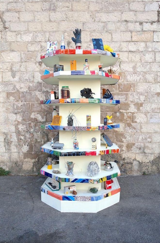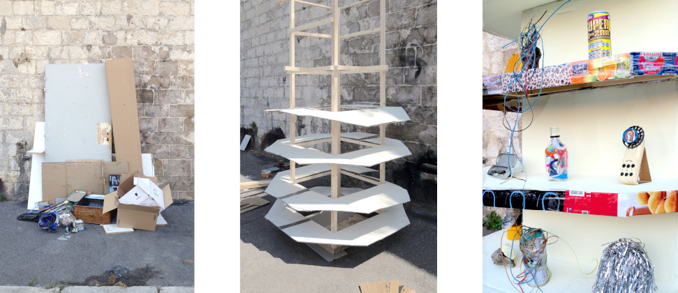 Au supermarché, la gondole est le mobilier utilisé pour attirer notre attention sur les marchandises. L’efficacité du dispositif réside dans sa discrétion, son invisibilité, pour offrir tout l’espace visuel au marketing produit et aux packagings. Constamment mis en scène, le meuble tel quel, pourtant familier et quotidien, échappe bien souvent à notre perception. Transposée seule dans l’espace public, la gondole devient tout à coup visible. Clairement identifiable, sa fonction attise regards et convoitise. Sa représentation devient emblème de nos sociétés capitalistes. Les étagères, confectionnées en carton de récupération et habillées d’emballages en tout genre, exposent un ensemble manipulé de déchets trouvés sur place. Soumis aux regards et à l'évaluation des passants, la gondole devient l’objet d'une attention particulière où cherche à se fixer le désir. Les déchets transformés appâtent l’œil grâce à leur présentation improbable. Par cette apparition trompeuse, le caractère fabriqué, médiatisé et manipulé de notre rapport au monde à travers la consommation s’affiche clairement.
