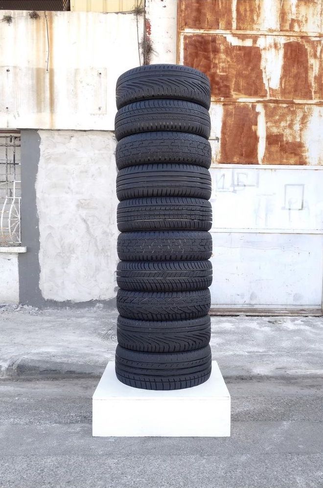 La roue, élément de base de nos moyens de transports, est omniprésente dans nos vies. Son évolution matérielle et ses déclinaisons à travers le temps, en font un objet technique indispensable. Sa représentation universelle est symbole de mobilité, d’évolution et d’indépendance. Pourtant, son utilisation quotidienne nous est bien souvent insouciante. De cette utilisation massive, le constat est clair, six pneus arrivent en fin de course chaque seconde. Composés de matières toxiques et peu dégradables, leur recyclage est complexe. Sur le territoire surgissent des cimetières sauvages à la douce odeur caoutchouteuse. Dans ces zones, à l’abri des regards et intimement vastes, s’empilent d’innombrables cadavres de pneus. Du paysage à l’abandon émerge une stèle éphémère noirâtre. Soigneusement choisis et empilés, une sélection de pneus est unifiée, maquillée, magnifiée. Jouant entre brillance et matité, une fois peints, ils retrouvent un éclat d’origine superficiel. Embaumés et disposés ainsi sur un piédestal, ils paraissent comme parachutés dans un contexte inapproprié.