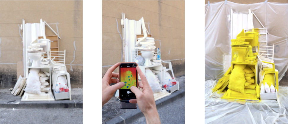 La chaleur représente l’un des enjeux majeurs de nos sociétés. Le réchauffement climatique est en lien direct avec nos manières de vivre et de consommer. Nos méthodes de productions excessives impactent notre environnement et complexifient les notions de revalorisation. Tous les objets représentent un coût énergétique dont nous payons inconsciemment le prix. Les couleurs visibles sur les déchets sont dictées par une caméra thermique et représentent la chaleur emmagasinée par chaque objet. L’outil numérique permet d’accéder à une perception invisible à l’œil nu. À partir du smartphone, la photographie capturée devient modèle impressionniste. Par reproduction, la peinture se dessine en volume. Les couleurs peintes à la main font émerger du sol un dégradé multicolore et chatoyant. En fort contraste avec son contexte, le résultat attire notre regard par son esthétique criarde et surréaliste. Généralement inaccessible, une réalité scientifique devient soudainement perceptible, insufflant une nouvelle profondeur aux objets qui nous entourent.