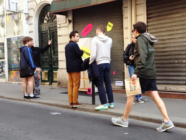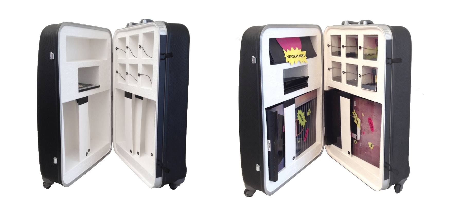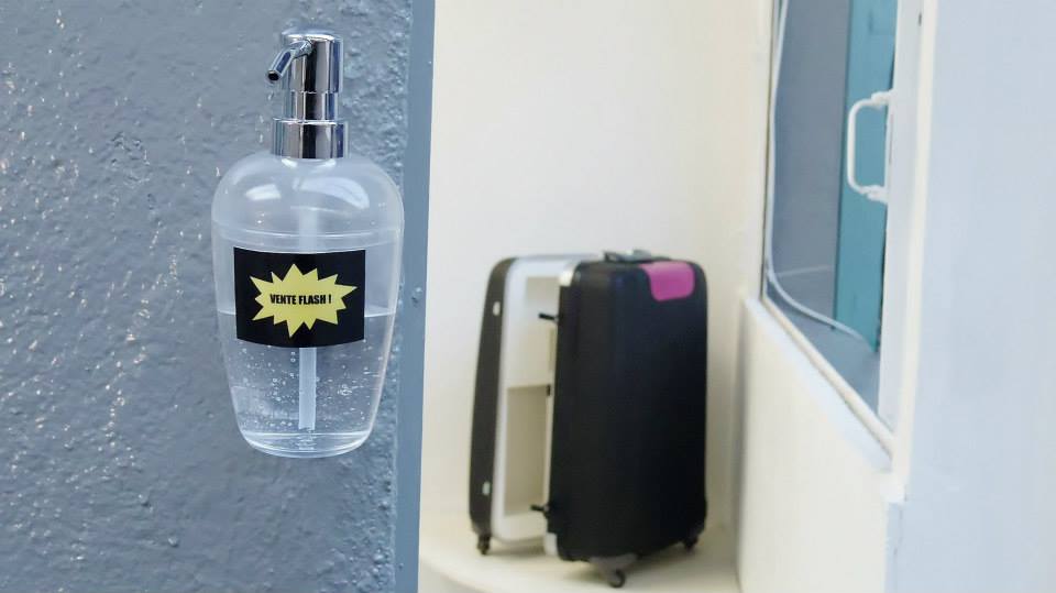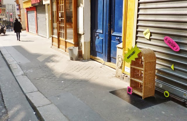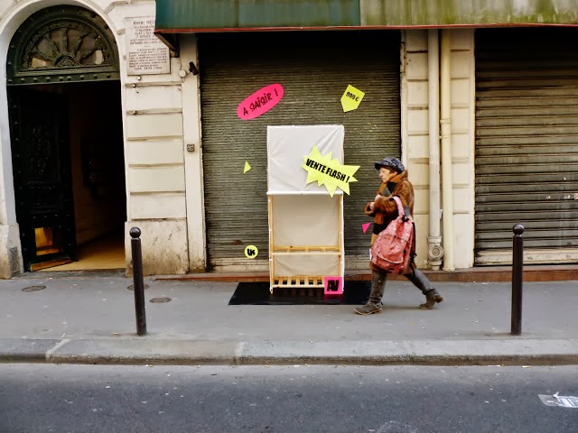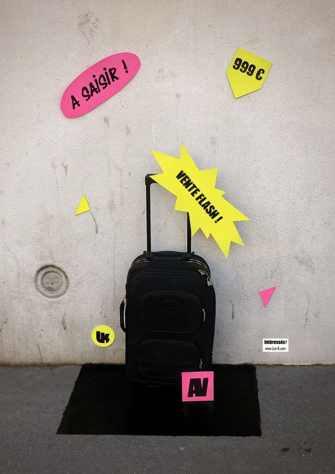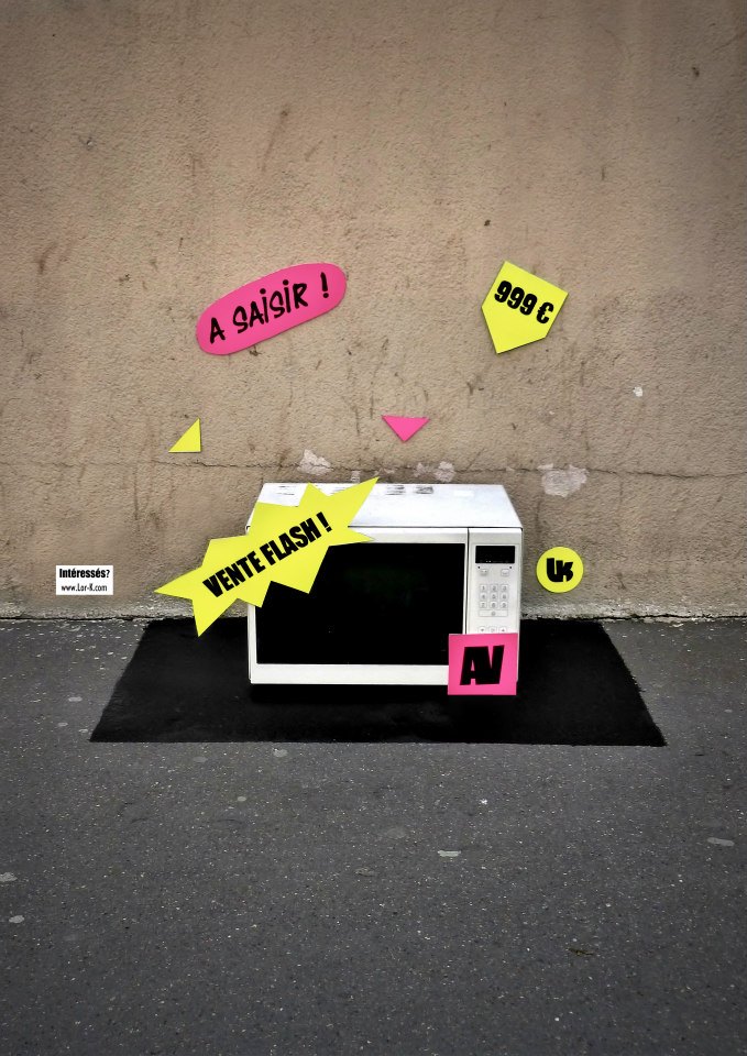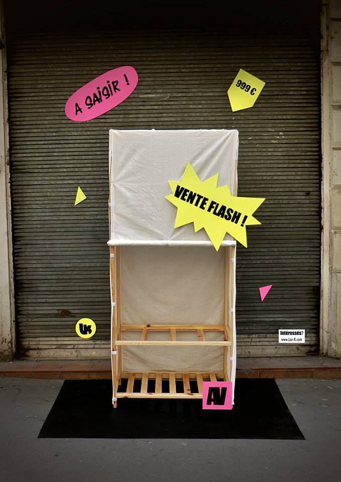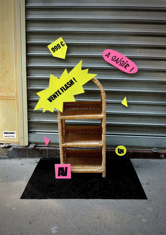 Orchestrées dans les rues de Paris un 1er avril, des pancartes aux couleurs criardes, annoncent une mise en vente imminente. À saisir, en pleine rue, sur un marquage au sol noir, mobilier et électroménager sont placés au centre de l’attention. Affichant un prix excessif, en contradiction avec leur posture d’abandon, un mercantilisme ambigu s’installe. Entre objets convoités et encombrants délaissés, notre interprétation est troublée par le soin accordé à la mise en scène. Poussée à son paroxysme, la présentation commerciale nous invite à questionner l’aspect manipulateur du merchandising et de la publicité. Du primaire au plus superficiel, le marketing anticipe tous nos besoins. Sur le trottoir, laissé à son libre-arbitre, notre jugement de valeur est mis à l’épreuve par la situation.